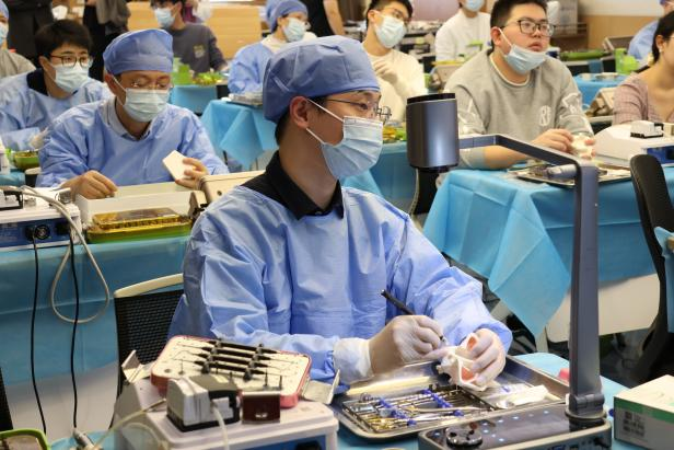 随后,在杨帆、王林红、丁榆德等资深医师的一对一指导下,学员们在模型上进行了实操演练。从切口设计到开窗技巧,从黏膜剥离到骨粉填入,导师们手把手教学,耐心纠正操作手法。学员们纷纷表示,这种“理论+示教+实操”的沉浸式学习模式,让他们真正掌握了上颌窦外提升术的核心要领,受益匪浅。